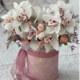 Романтическая композиция в шляпной коробке состоит из 7 французских роз, 5 альстромерии, 10 веток эустомы, 15 гвоздик, 8 веток кустовых роз, 10 маттиол . Цвет коробки и оттенок цветов может отличаться от образца.