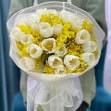 Нежный букет из 19 веток белой ромашковидной хризантемы и танацетума в современной декоративной упаковке.