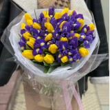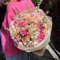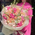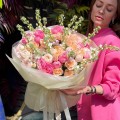 Шикарный букет из 30 веток кустовой розы и 15 веток маттиолы с добавлением зелени в современной упаковке.