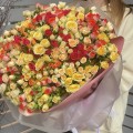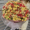 Потрясающий букет из 51 ветки кустовой розы нескольких оттенков в декоративной упаковке.