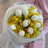 Очаровательный букет из 11 орхидей и 14 веточек мимозы в современной упаковке.