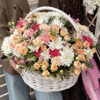 Эта яркая цветочная корзина состоит из розовых роз, маттиолы, эустомы, французских роз, гвоздик, альмстромерий. Общее количество 151 цветок.