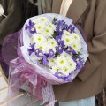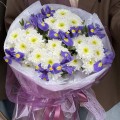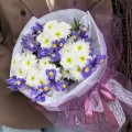 Оригинальный букет состоит из 9 ирисов и 4 веточек белой хризантемы с добавлением зелени. Сорт хризантемы может отличаться от образца на сайте.