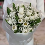 Милый букет из кустовых и одноголовых роз и маттиолы в декоративной упаковке. Общее количество 11 шт.