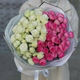 Букет состоит из 7 гвоздик, 6 кустовых роз, 5 альстромерий, 4 ветки хризантемы, 2 ветки эвкалипта, 3 ветки эустомы в современной упаковке.