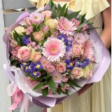 Очаровательный зимний букет из трех видов хвои, цветков орхидеи (цимбидиум), илекса и декоративной зеленив крафт бумаге.
