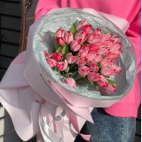 Неповторимый букет из маттиолы, эустомы, кустовой розы, танацетума и эвкалипта в декоративной упаковке. Общее количество цветов 21.