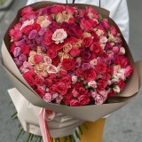 Милый букет из кустовых и одноголовых роз, маттиолы, эустомы, ларгуса в декоративной упаковке. Общее количество 15 шт.
