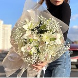 Незабываемый букет состоит из 5 белых лилий и декоративной зелени в упаковке.