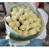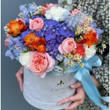 Милый букет из роз, кустовых роз, дильфиниума, эвкалипта в декоративной упаковке. Общее количество 7 шт.