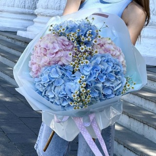 Шикарный букет из 4 гортензий, 6 веток кустовых роз, 11 гвоздик в декоративной упаковке.