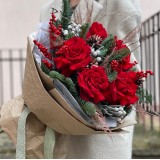 Сказочный, новогодний букет из веток нобилиса, 2 ветки аморалиса, зимнего декора и декоративной зелени в упаковке.