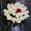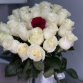 Шикарный букет из 24 белых роз сорта «Мондиаль» и 1 бордовой, перевязанных атласной лентой. Длина стебля 60 см.Бесплатная доставка по Минску, в областные и районные города Беларуси доставка платная.