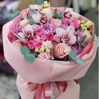Милый букет состоит из сочетания 7 веток хризантемы, 12 гвоздик, 4 веток кустовой розы в декоративной упаковке.
