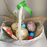 Пасхальная корзина состоит из кулича, пасхальных яиц, конфет, пасхального полотенца и пасхального декора. Цвет и форма корзин, производитель продуктов может отличаться от образца.
