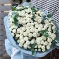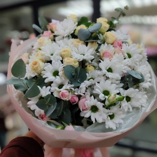 Оригинальный букет состоит из 27 хризантем с зеленью в декоративной упаковке. Цвет упаковки и оттенок цветов может отличаться от образца на сайте.