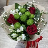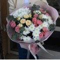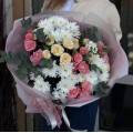 Сборный букет из 5 веток хризантемы, 5 веток кустовой пионовидной розы двух оттенков, 5 гвоздик, декоративная зелень, современная упаковка.
