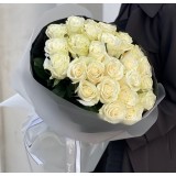 Незаурядный букет из 19 веток бордовой и малиновой розы с добавлением декоративной зелени в темном оформлении.