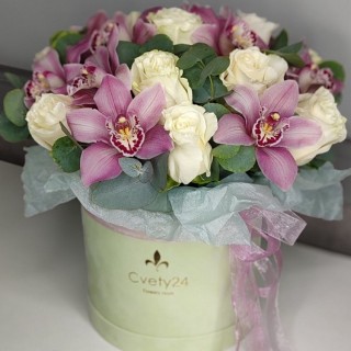 Композиция в коробке диаметром 40 см из кустовый, пионовидных, французских роз, эустомы и набора из пирожных ассорти (сладости могут отличаться от представленных в образце).